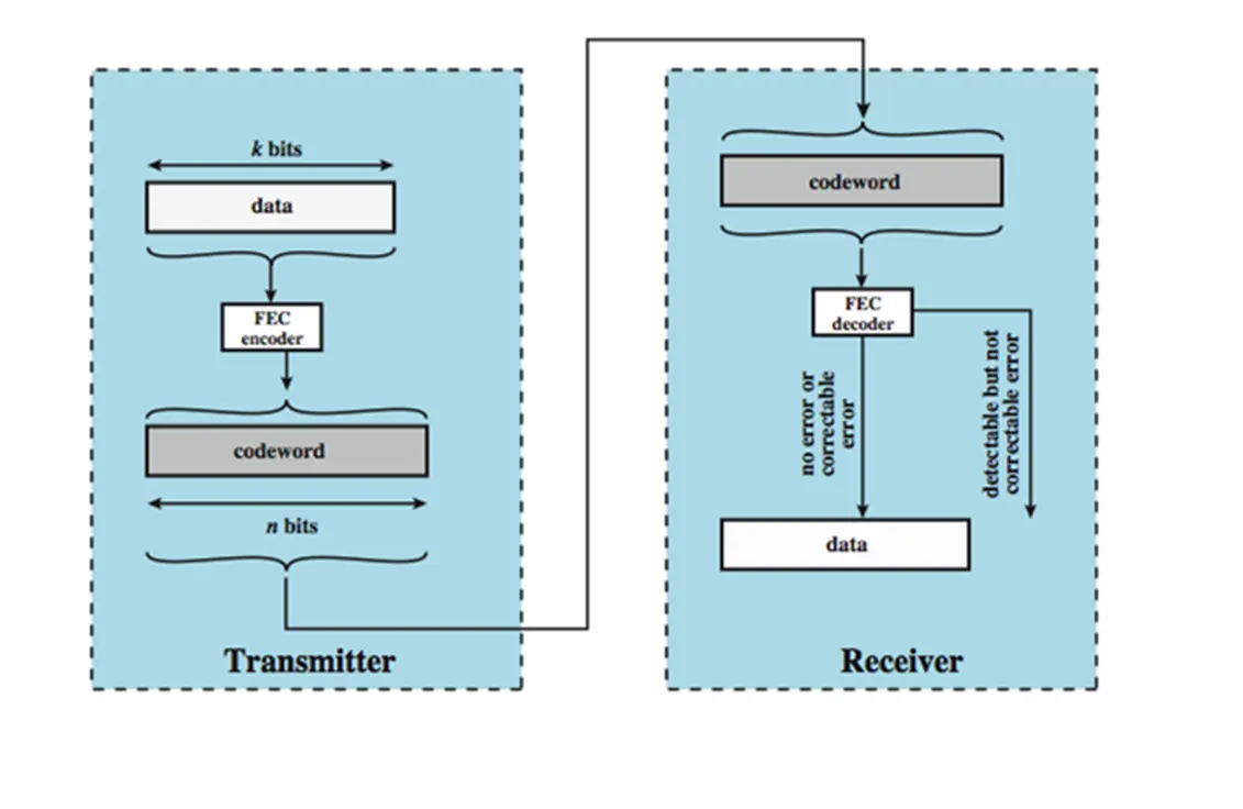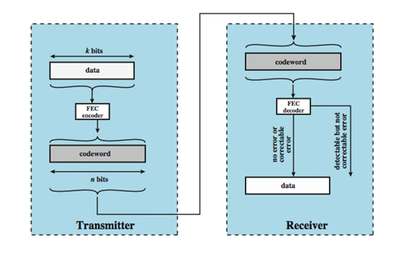 k๋นํธ ๋ธ๋ก ๋ฐ์ดํฐ๊ฐ ์ฃผ์ด์ง๋ฉด ์ก์ ๊ธฐ๋ n-k์ฌ์ด์ฆ ํ๋ ์ ๊ฒ์ฌ์ด(Frame Check Sequence : FCS)๋ฅผ ์์ฑํ๋ค.