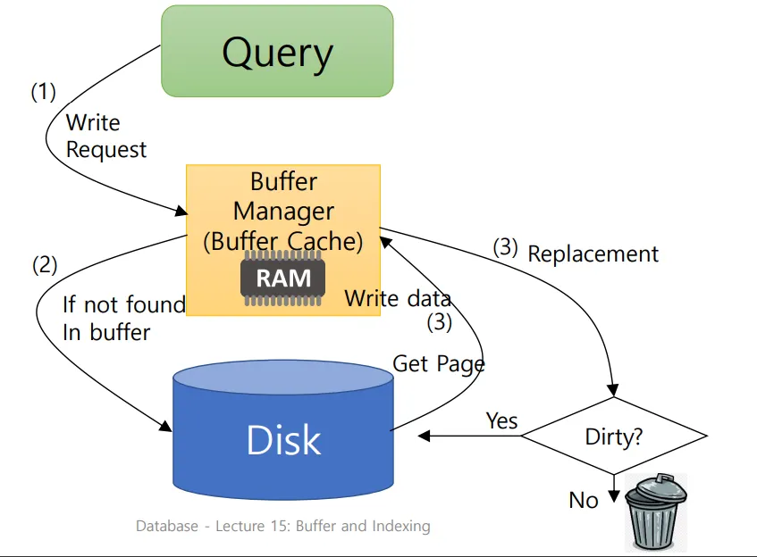 버퍼에 있는 데이터가 수정되었을 경우(Dirty) 디스크에 다시 쓴다.