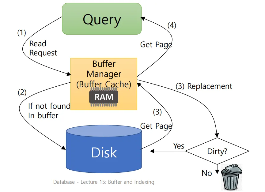 버퍼 매니저는 디스크에 있는 데이터를 읽을 때, 미리 메모리에 올라와있다면 바로 리턴, 아니면 읽는 구조.