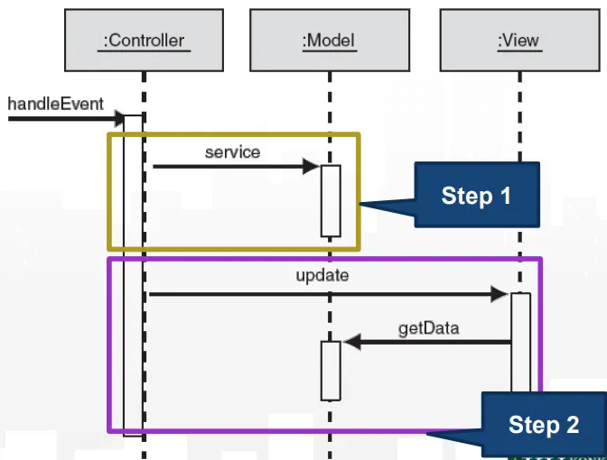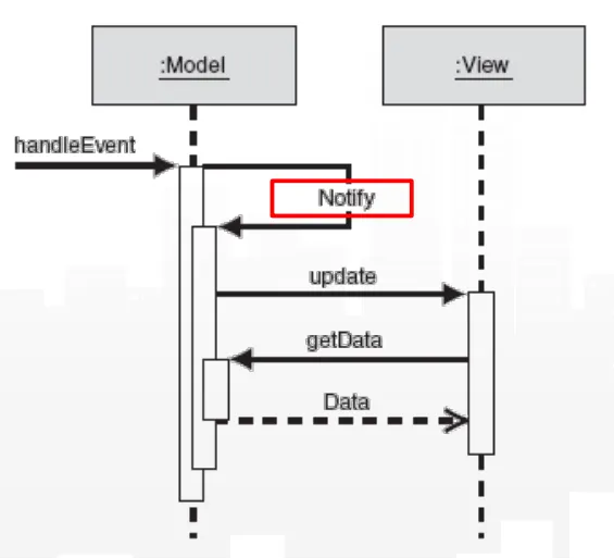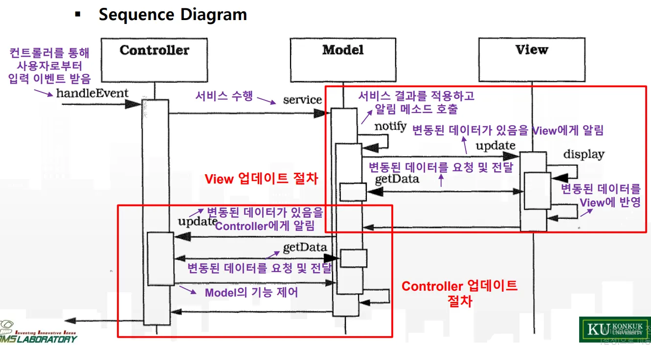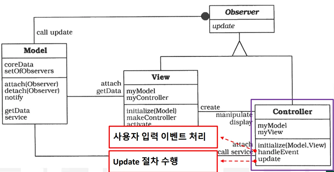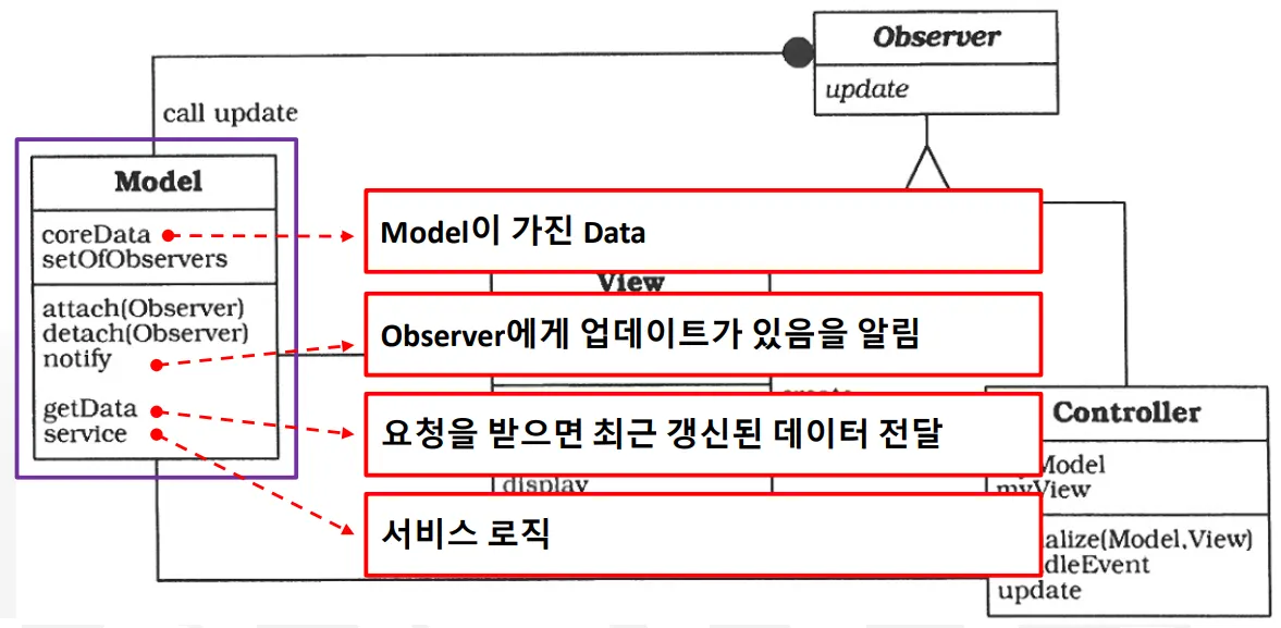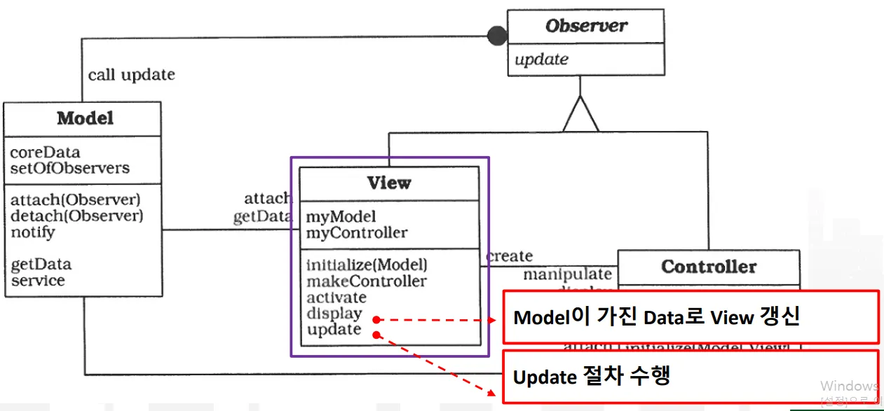 서비스 결과를 View에 갱신시키기 위해 Update를 알리고 View는 Model로부터 데이터를 얻어 갱신한다.