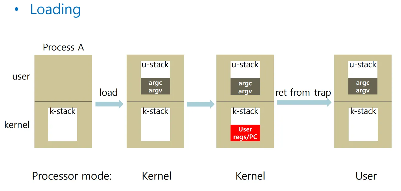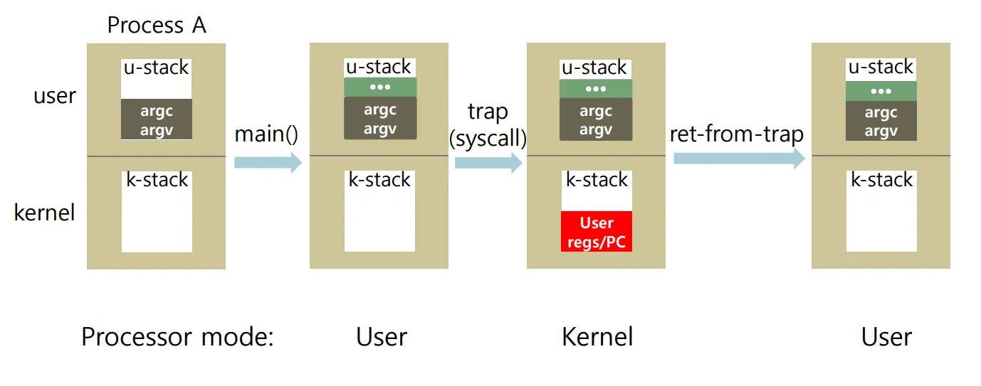 ์ ์ํํ ์ดํ, return-from-trap์ ํตํด ๊ถํ ๋ ๋ฒจ์ ๋ค์ ๋ฎ์ถ๋ค.