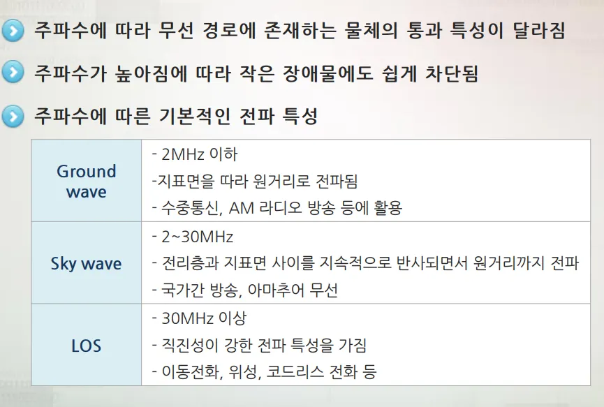 주로 거리에 의한 감쇠가 통신의 방해요소이다.