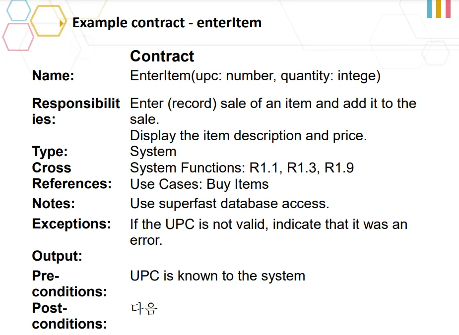 Use Case로부터 시스템 시퀀스 다이어그램을 추출, 시퀀스 다이어그램에서 시스템 오퍼레이션을 추출, 오퍼레이션에서 Contract를 추출하는 방식.