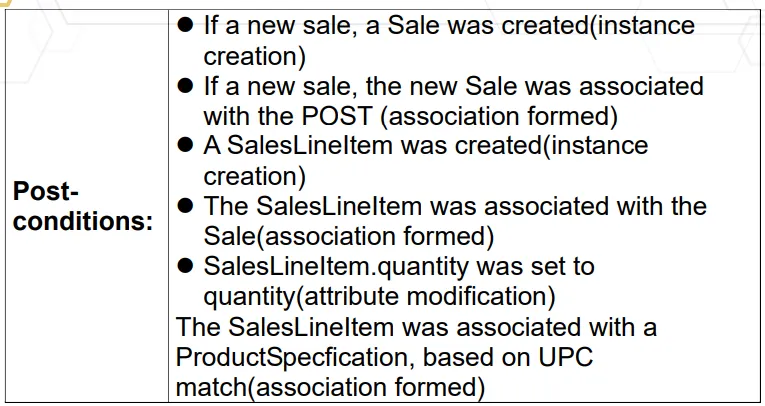 포스트 컨디션 : 시스템의 상태가 어떻게 변화하는지를 기술하는 곳. Class에서 State는 Attribute!