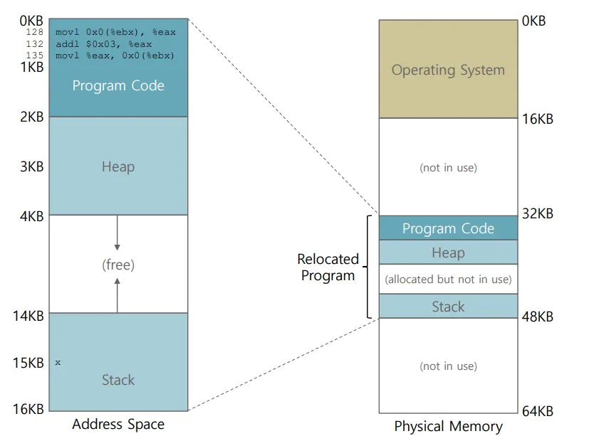 Physical address = Base + Virtual address(한 어드레스 스페이스 내의 오프셋처럼 취급가능)
