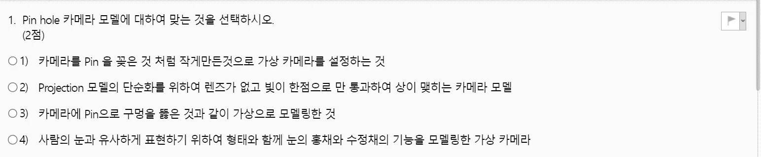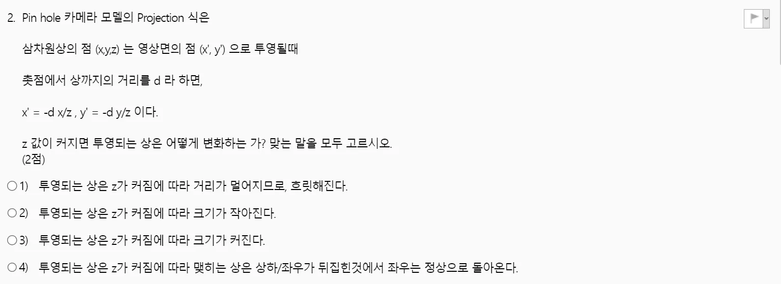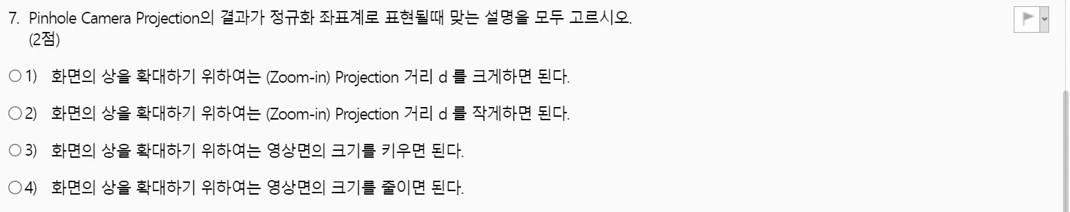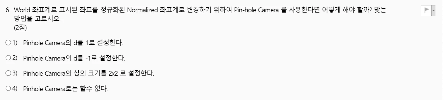์ด ์๋ค๋ฉด Pinhole Camera๋ก๋ Normalized Coordinate Systems๋ฅผ ๊ตฌํ ์ ์๋ค๊ณ ํ๋จํ๋ค. (4๋ฒ)