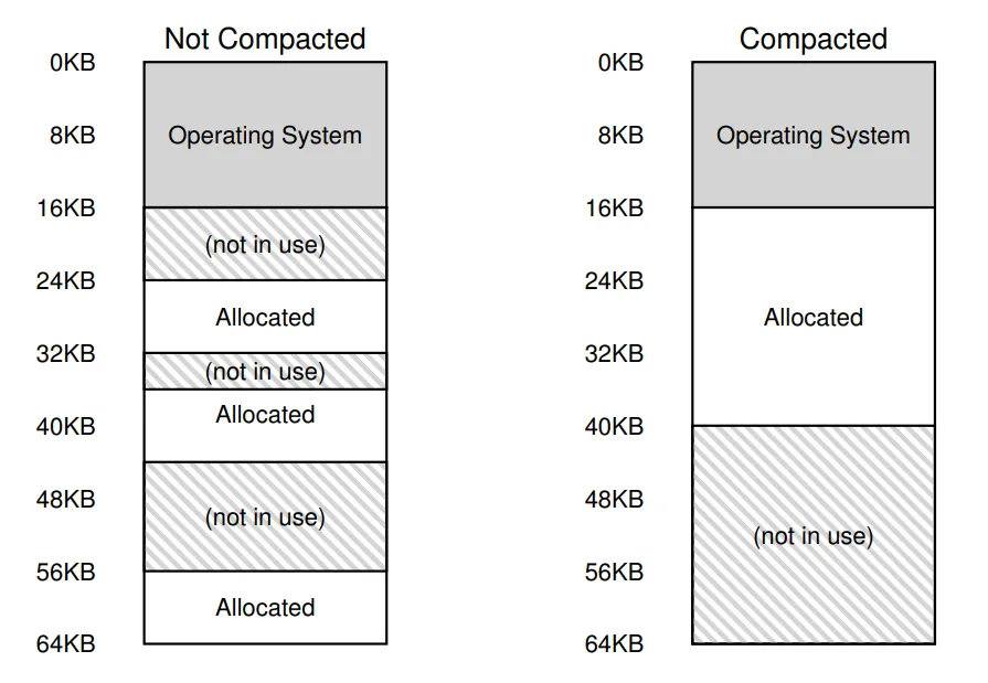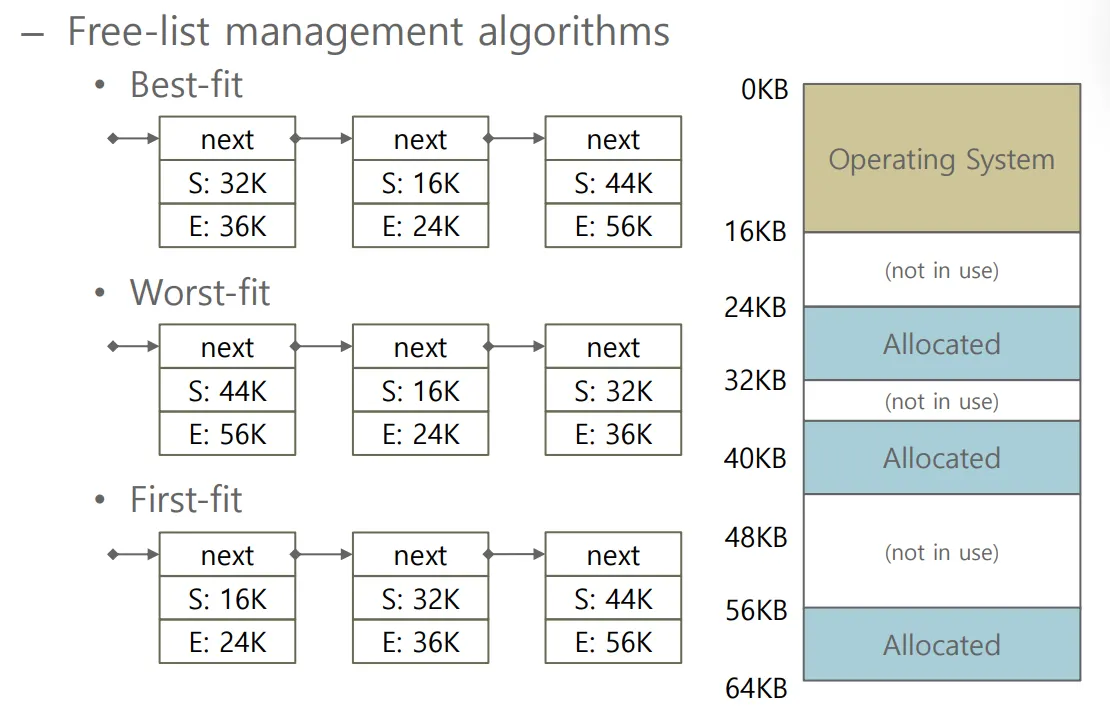 ์์ ๊ฐ์ด ๋ฉ๋ชจ๋ฆฌ๊ฐ ํ ๋น๋์ด์์ ๊ฒฝ์ฐ, ์ ํ๋ก์ธ์ค (20KB)๋ฅผ ํ ๋นํ๋ ค๊ณ ํ ๋, 24KB๊ฐ ์ด๋ก ์ ์ผ๋ก ๋น์ด์์ผ๋, ๋ชจ๋ ์๊ฒ ๋๋์ด ์์ด ํด๋น ์์ฒญ์ ์ถฉ์กฑ์ํค๊ธฐ ์ด๋ ต๋ค.