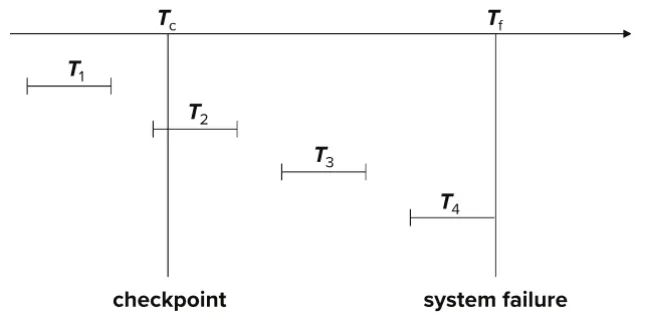 T2 주의. 체크포인트 이전에 커밋이 완료되지 않은 트랜잭션 모두 재검사의 대상이 된다.