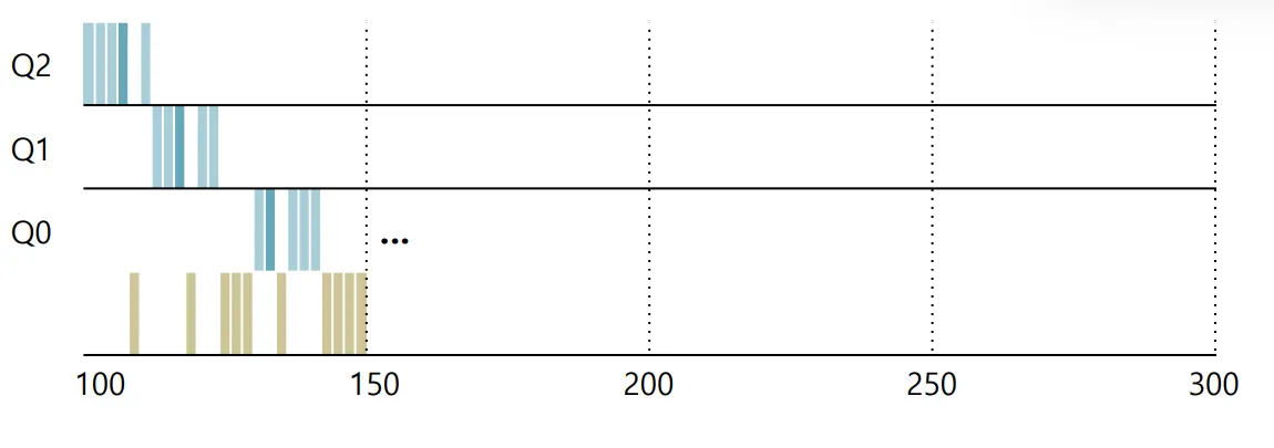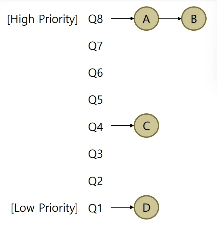 MLFQ๋ ์ฌ๋ฌ๊ฐ์ ํ๋ก ๊ตฌ์ฑ๋๋ฉฐ, ๊ฐ๊ฐ ๋ค๋ฅธ ์ฐ์ ์์(priority level)๊ฐ ๋ฐฐ์ ๋๋ค.