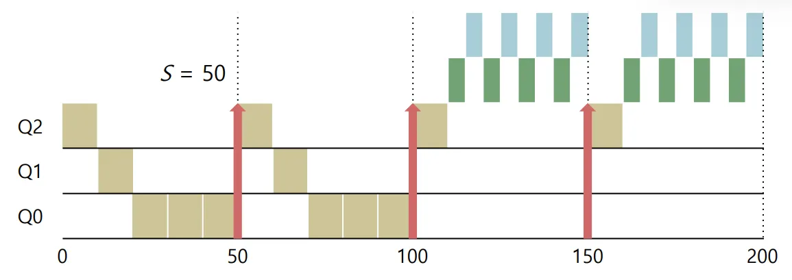 CPU-bound job์ด I/O-bound job์ผ๋ก ๋ฐ๋ ์ ์๋ค. ์ง๊ธ ์ํ์ MLFQ๋ ์ด๋ ํฐ์ด๋ฅผ ๋ค์ ์ฌ๋ฆฌ๋ ๊ธฐ๋ฅ์ด ์๋ค.